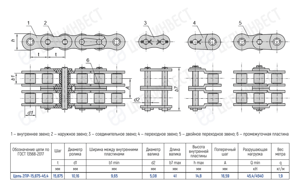 1 — внутреннее звено; 2 — наружное звено; 3 — соединительное звено; 4 — переходное звено; 5 — двойное переходное звено; 6 — промежуточная пластина