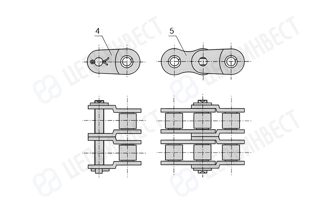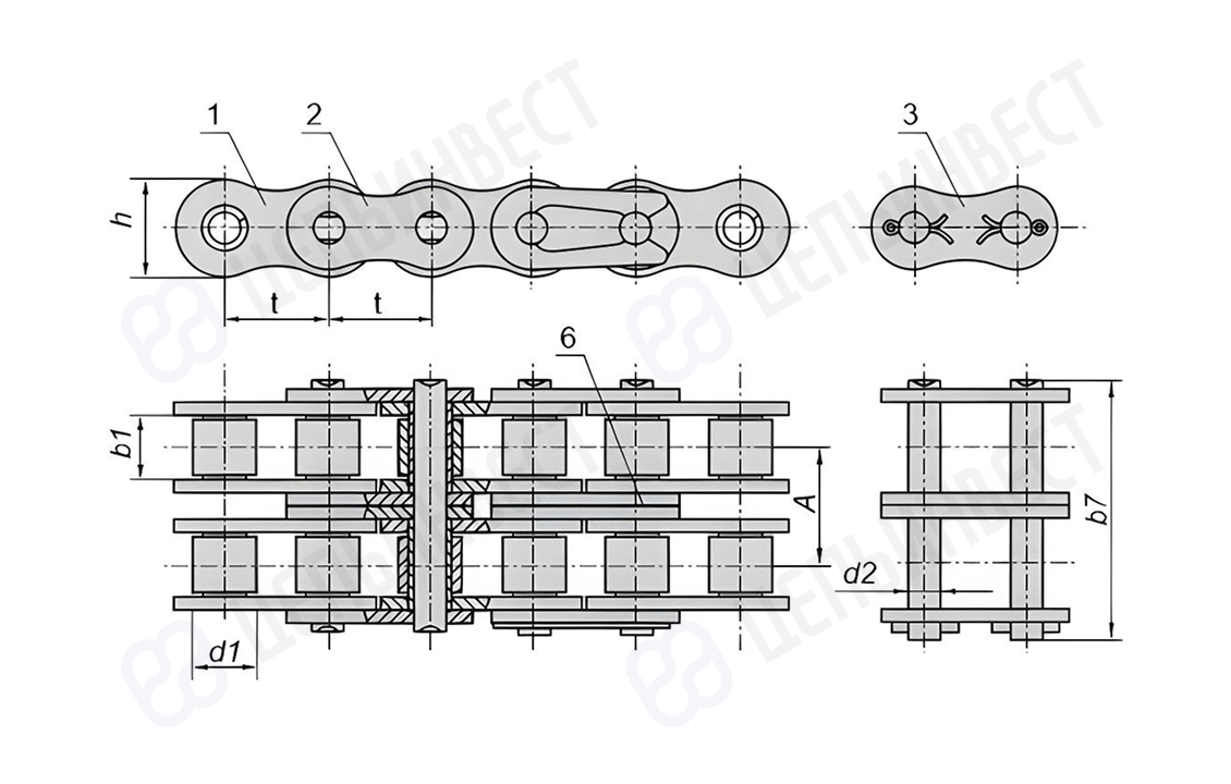 1 — внутреннее звено; 2 — наружное звено; 3 — соединительное звено; 4 — переходное звено; 5 — двойное переходное звено; 6 — промежуточная пластина