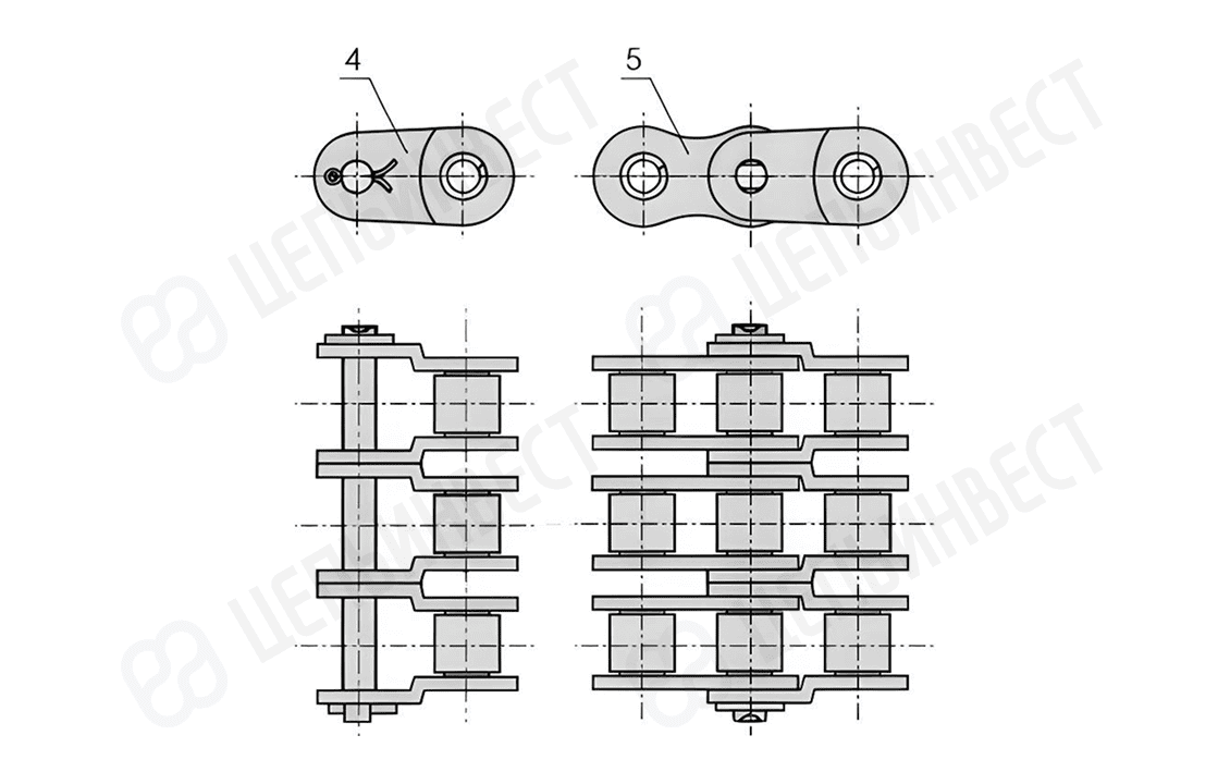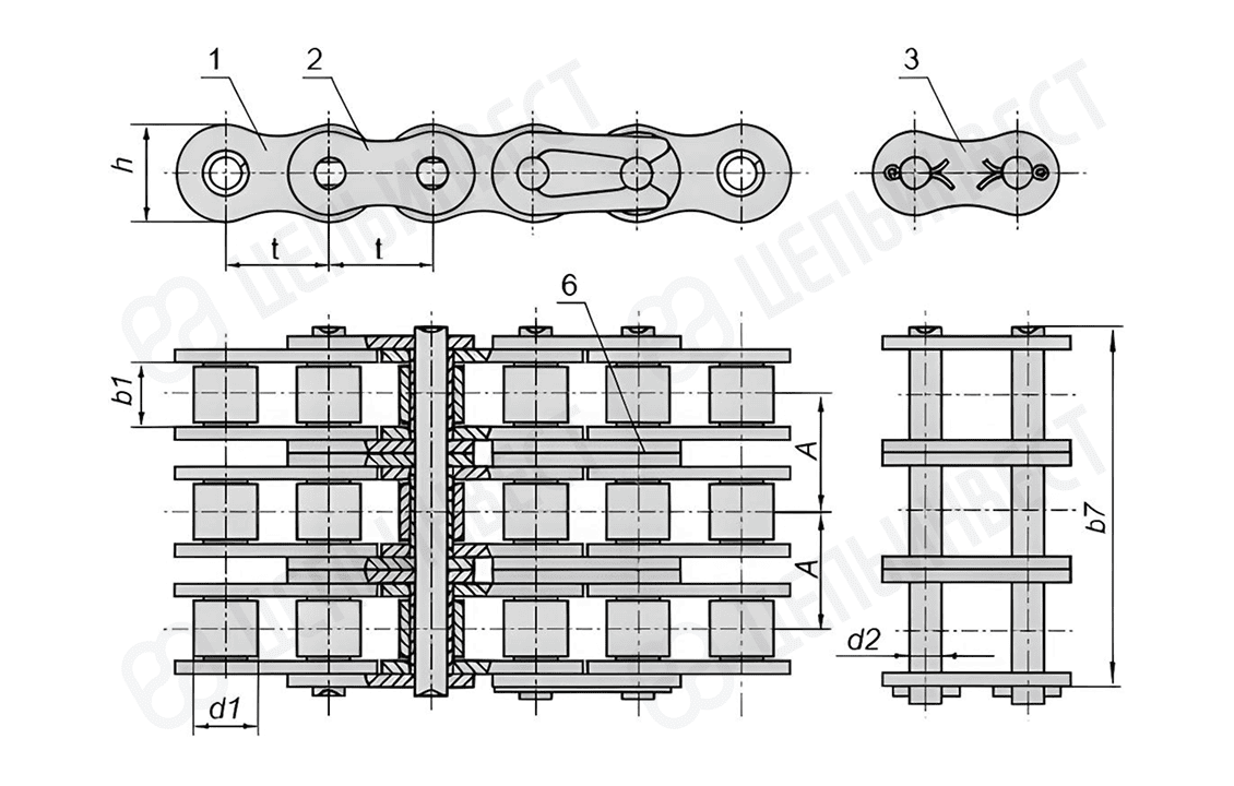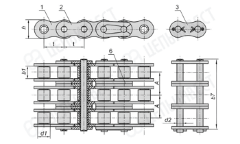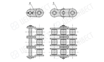 1 — внутреннее звено; 2 — наружное звено; 3 — соединительное звено; 4 — переходное звено; 5 — двойное переходное звено: 6 — промежуточная пластина