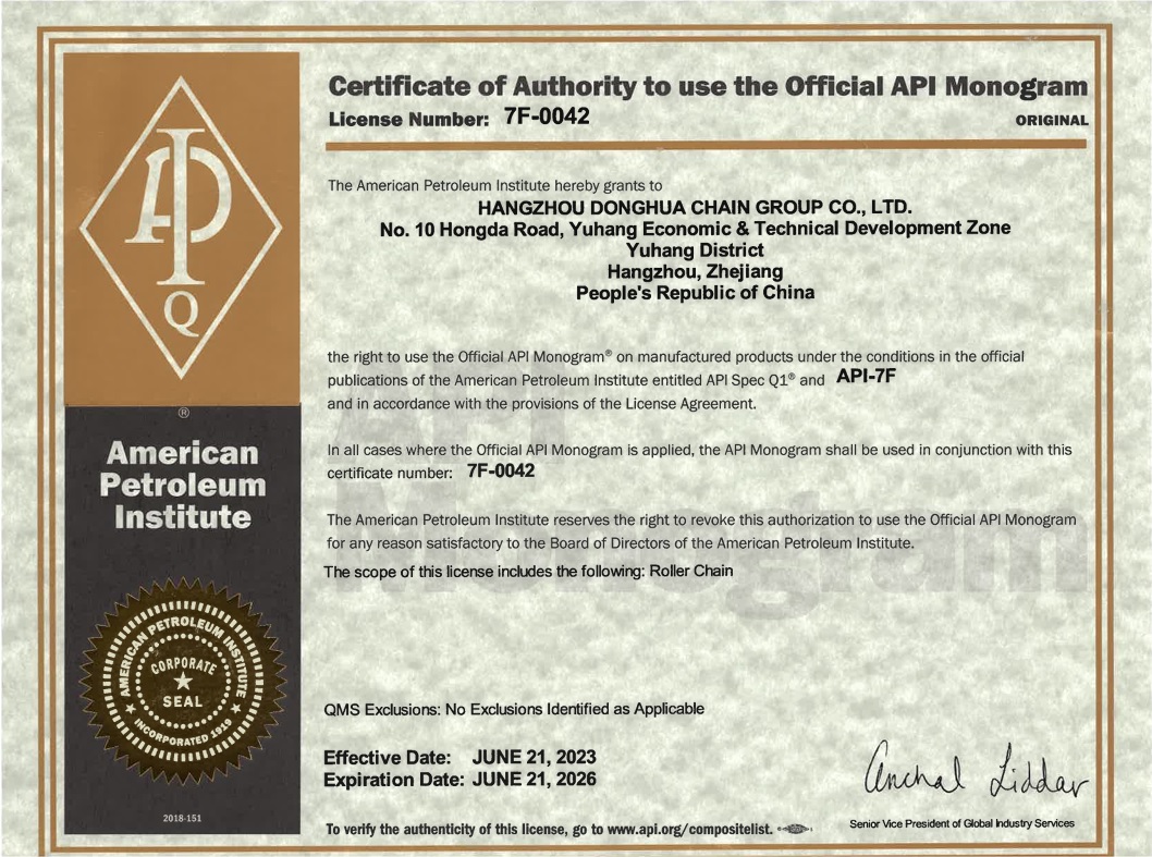 Неизменно высокое качество цепей DONGHUA обеспечивается через внедрение Системы Менеджмента Качества (ISO 9001). Благодаря данной системе завод DONGHUA осуществляет эффективное управление всеми производственными процессами. Современное инженерное проектирование, постоянное тестирование и проверка продукции осуществляются на каждом технологическом этапе. Применяются передовые технологии и автоматизация всех процессов производства – от обработки материалов и изготовления деталей до сборки цепей и проверки контроля качества – являются гарантией соответствия выпускаемого изделия заданным техническим характеристикам.
